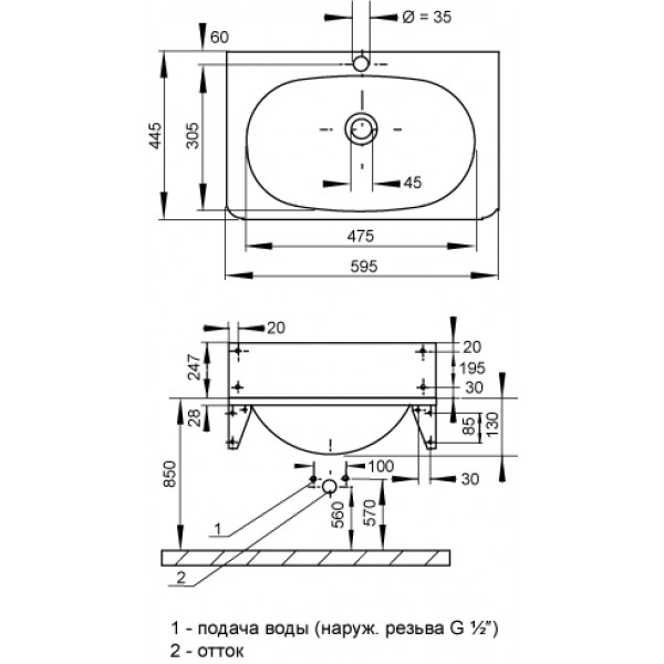 SLUN 02 - арт. № 93020 умывальник с отверстием для смесителя, переливной комплект, сифон, крепёжный комплект